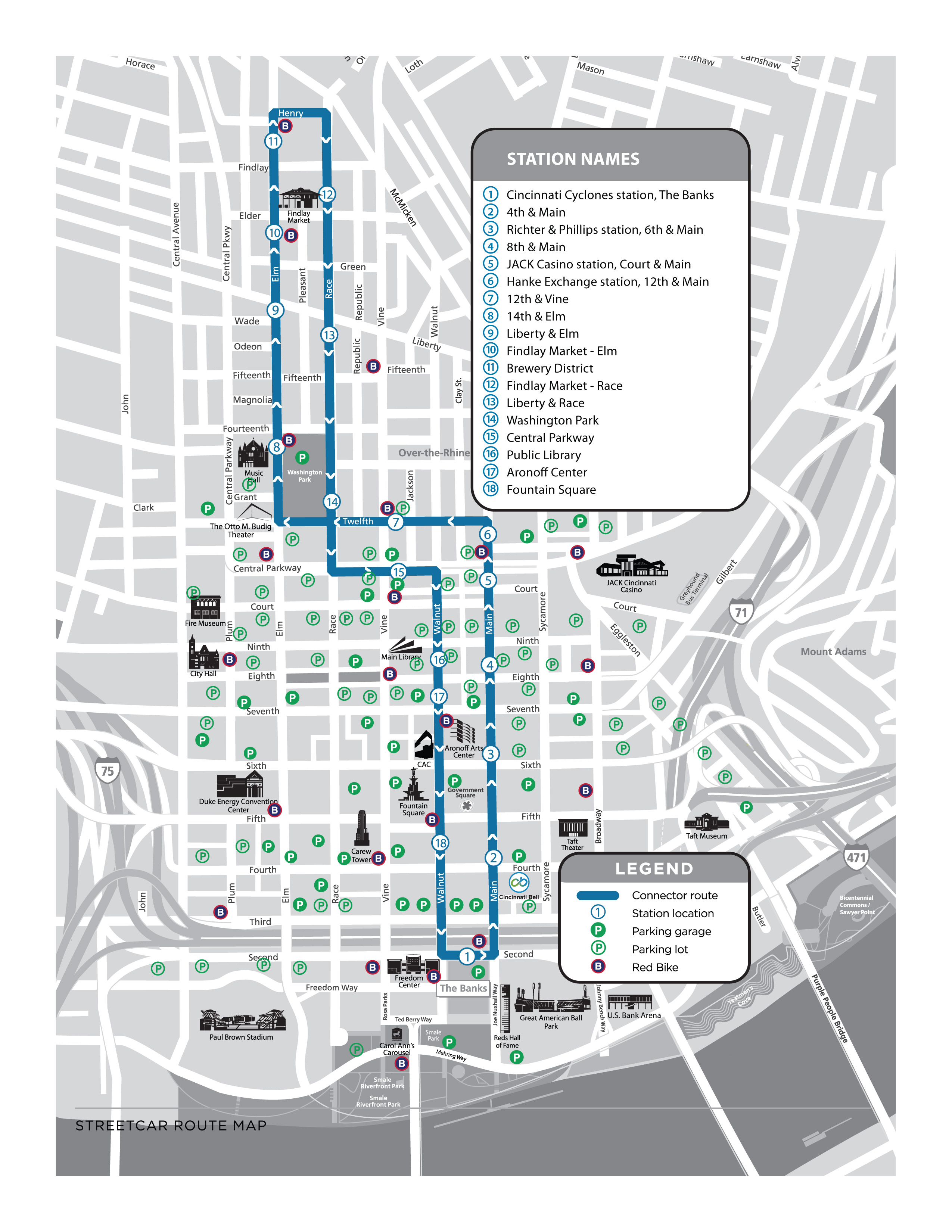 The Cincinnati Bell Connector streetcar is a 3.6-mile loop with 18 stations connecting major employment centers, arts, entertainment and businesses between The Banks, Downtown and Over-the-Rhine.